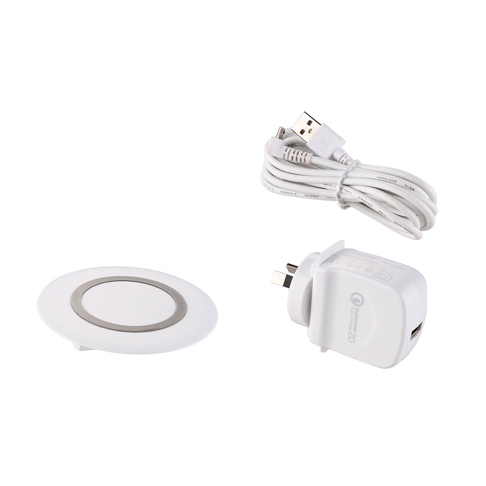 The Qi Wireless Fast Desk embedded Charger package comes with one Fast Desk Charger unit, a 1 m power cable, the Quick Charge 3.0 mains-powered USB wall charger and the user’s manual.